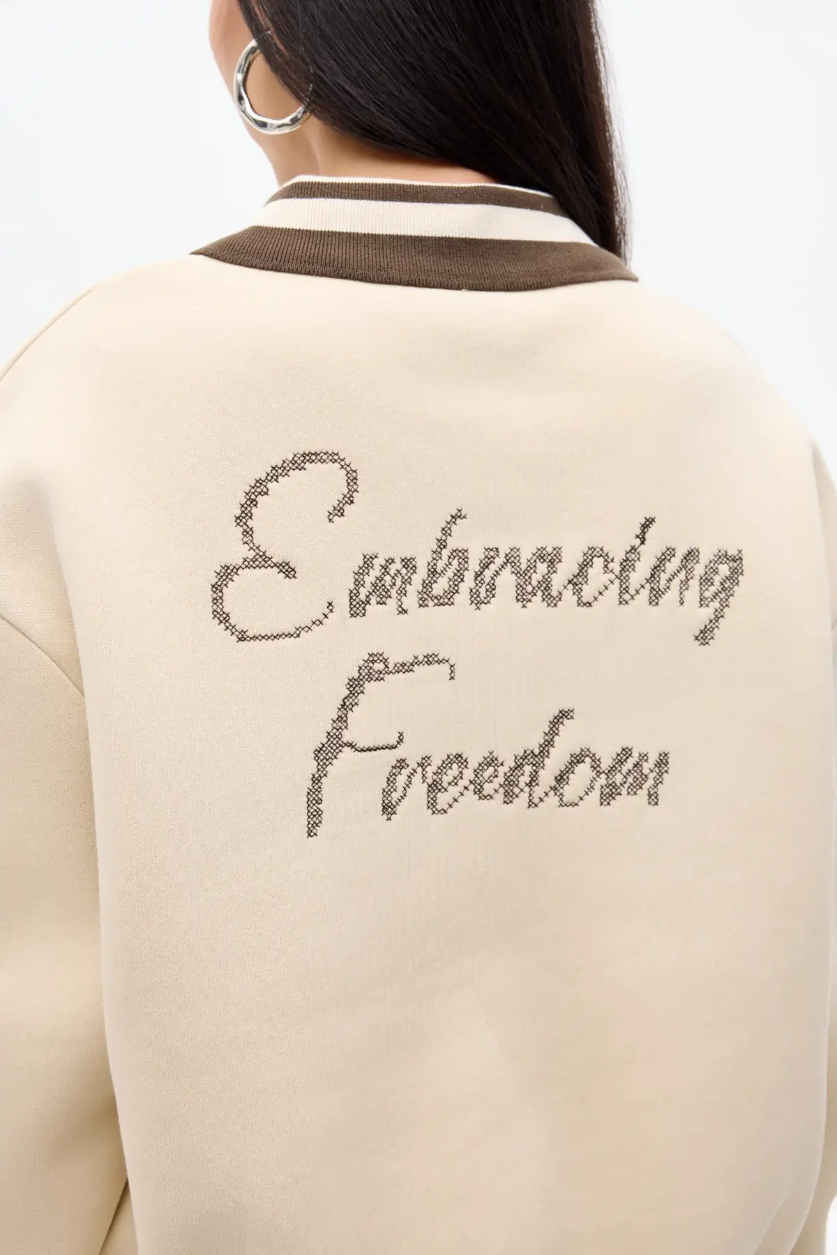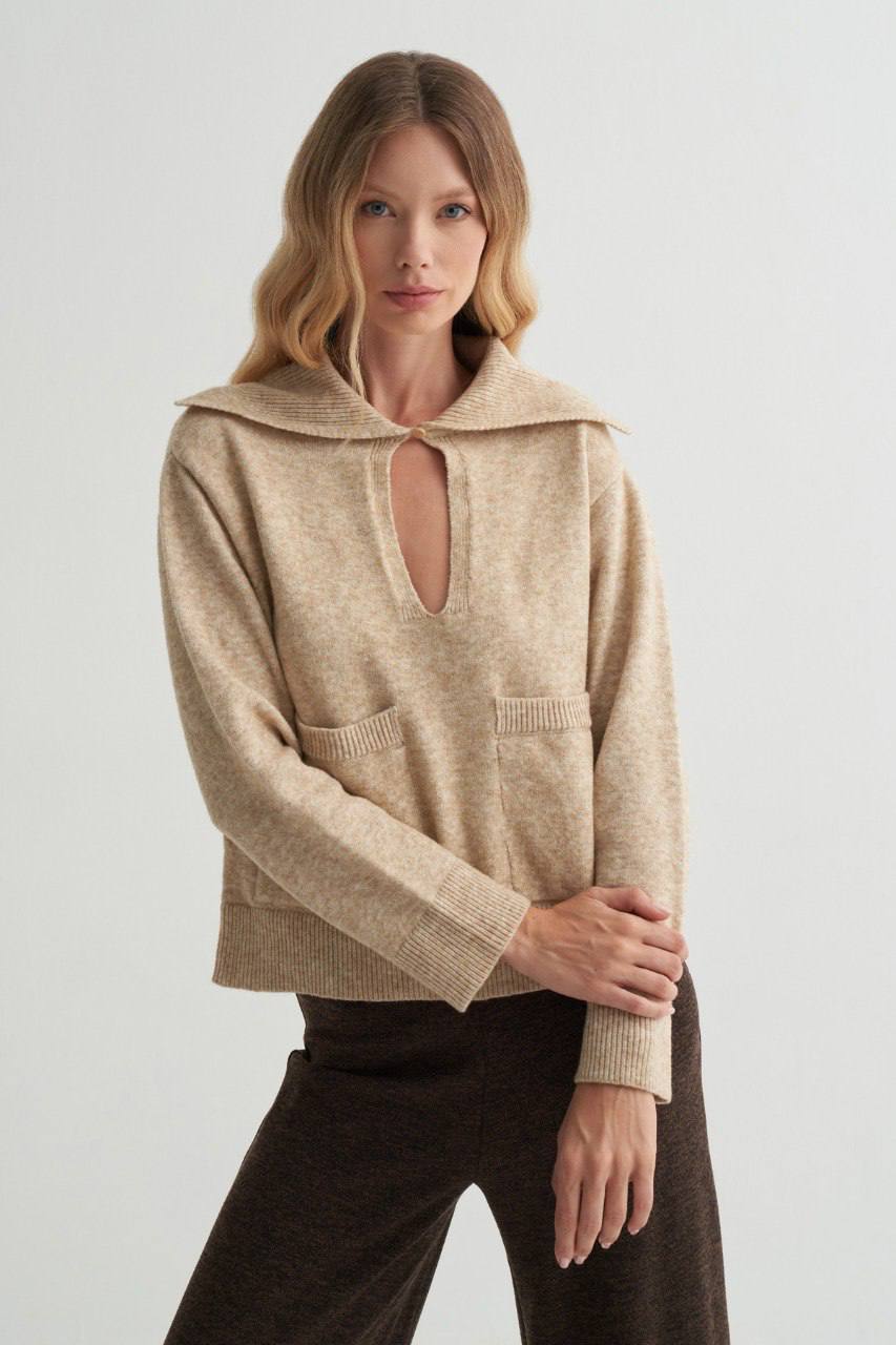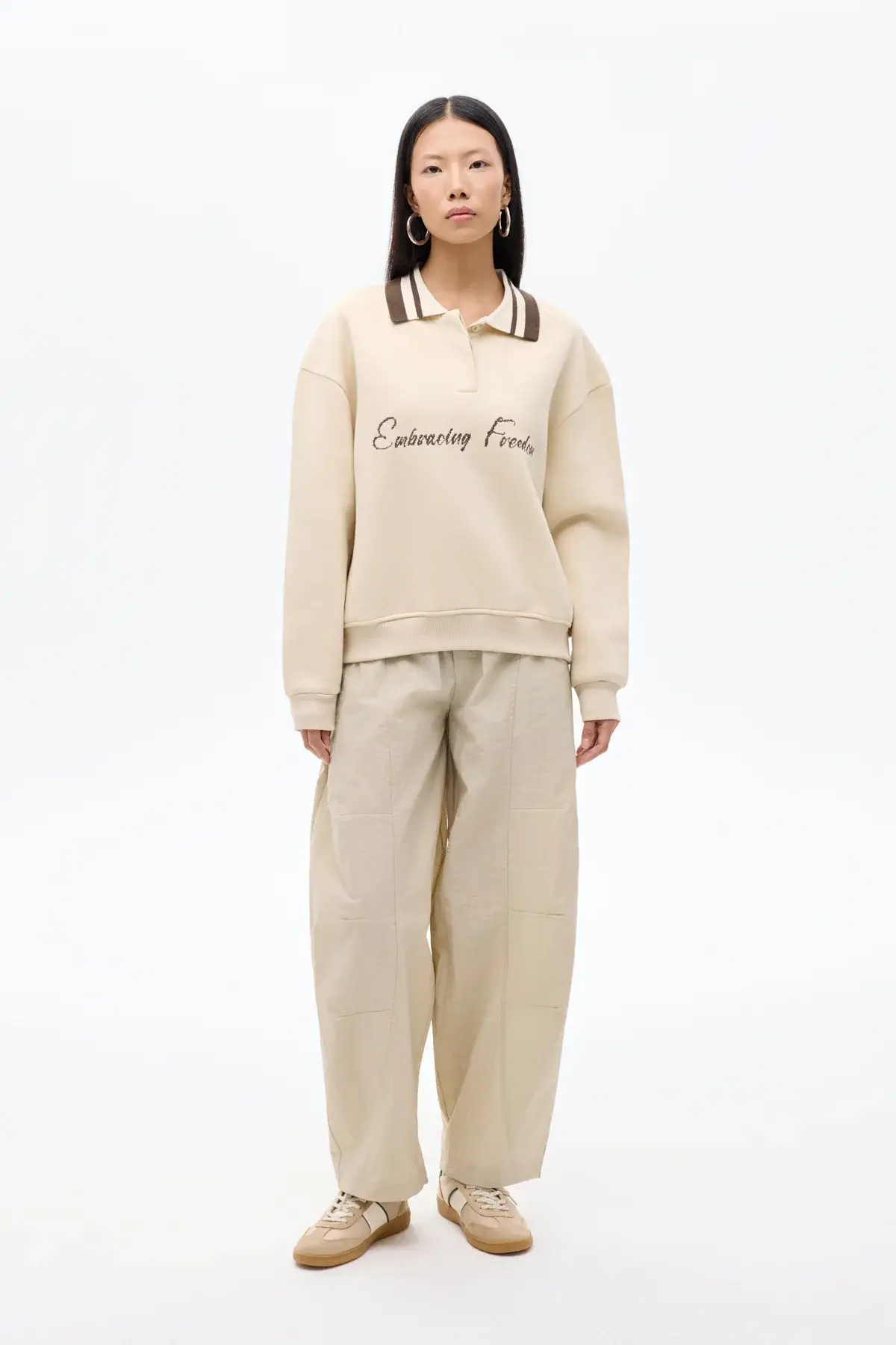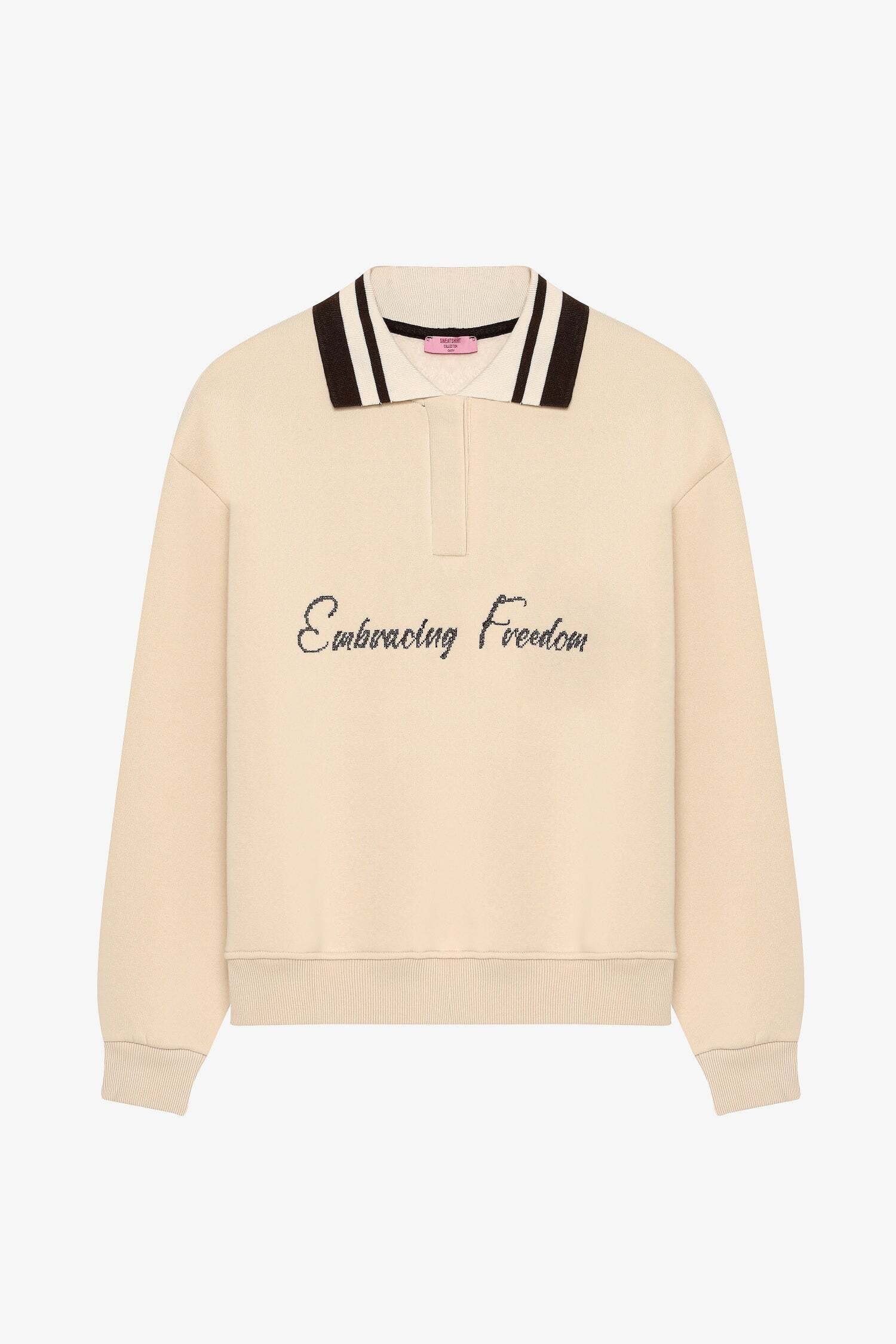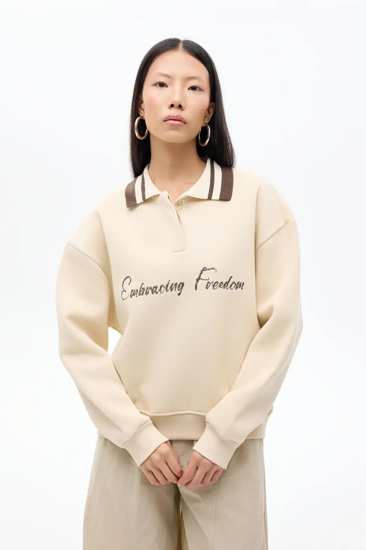 Свитер оверсайз с воротником-поло, полосатый, с вышивкой, бежевый