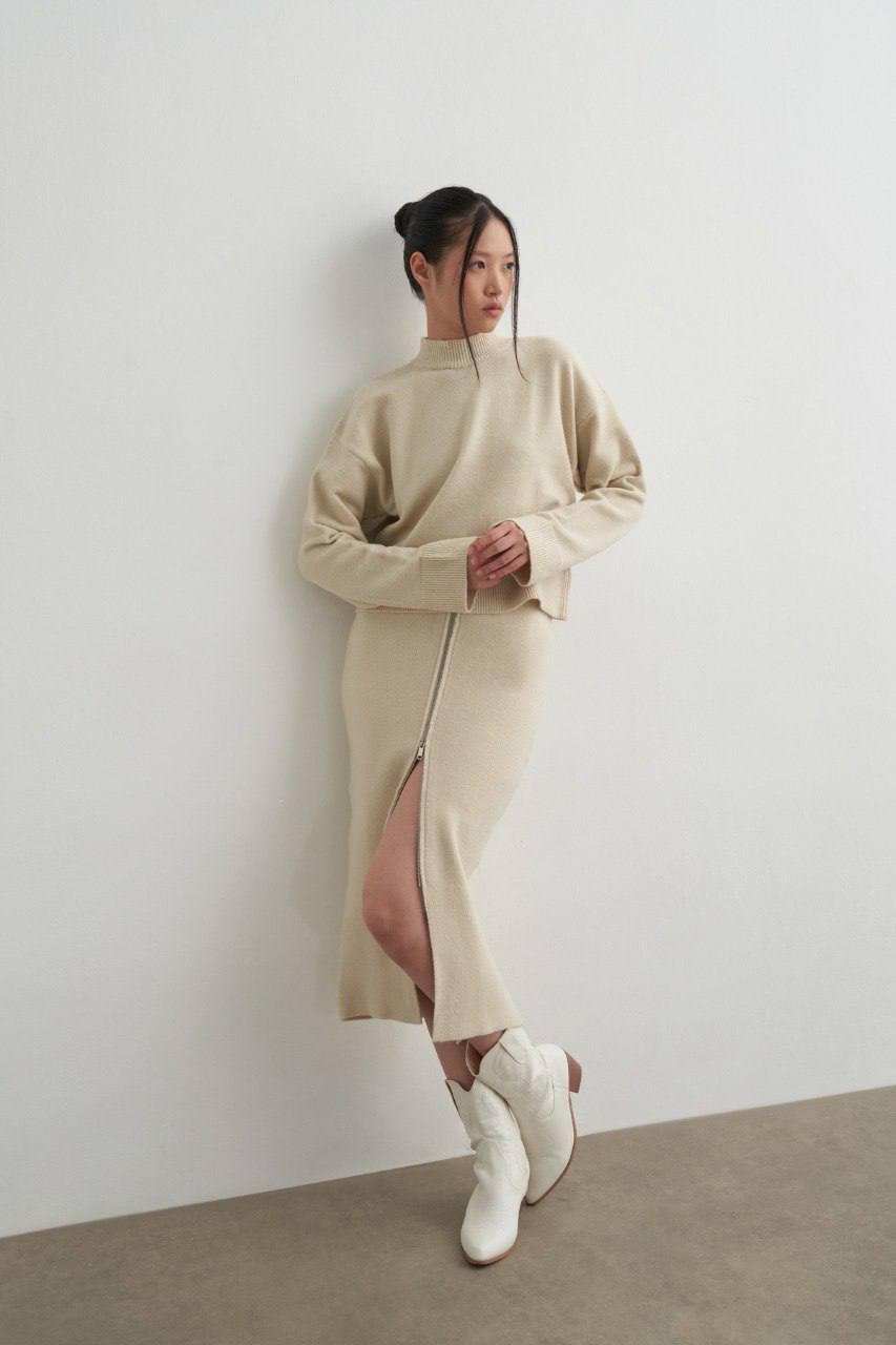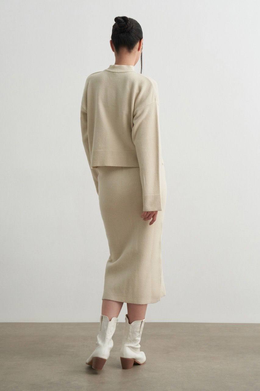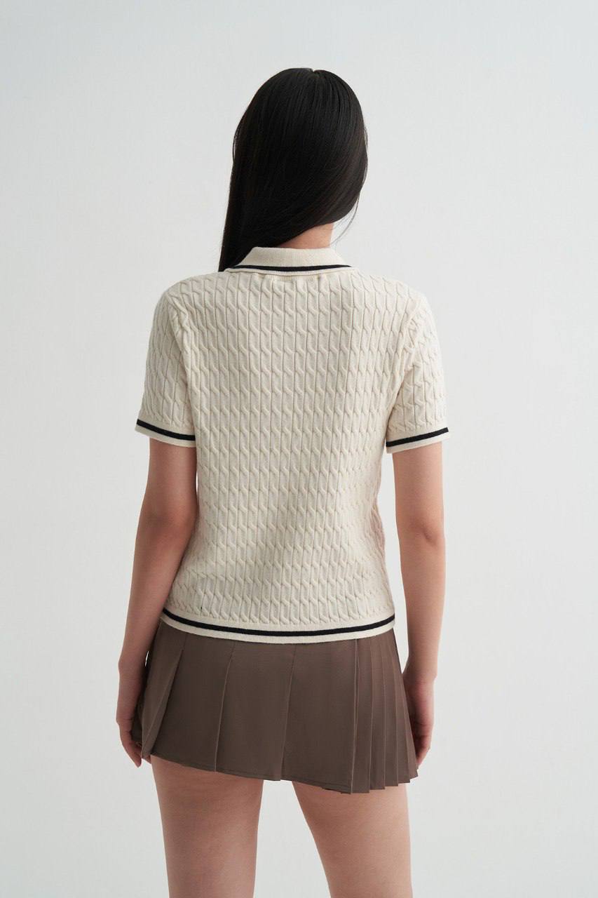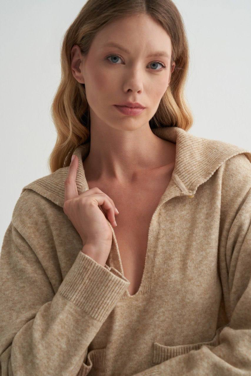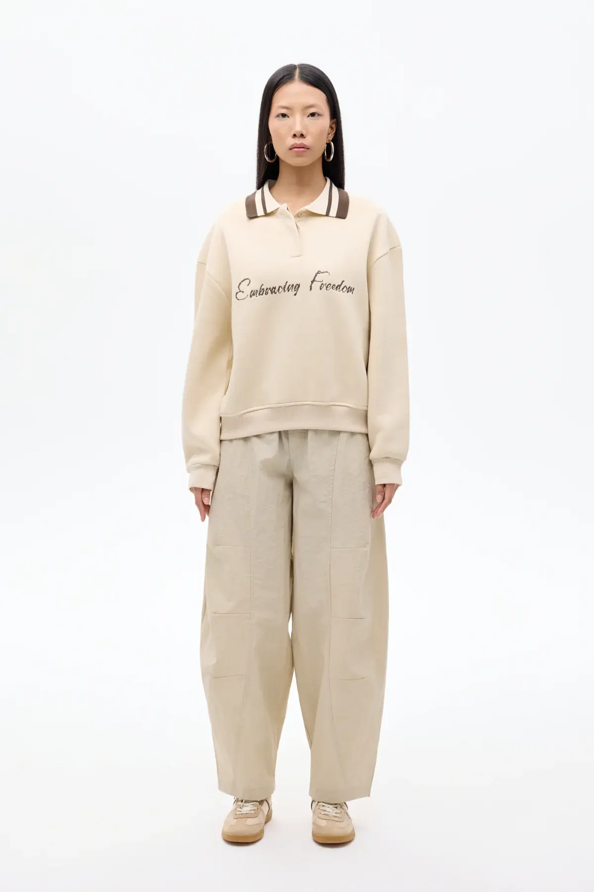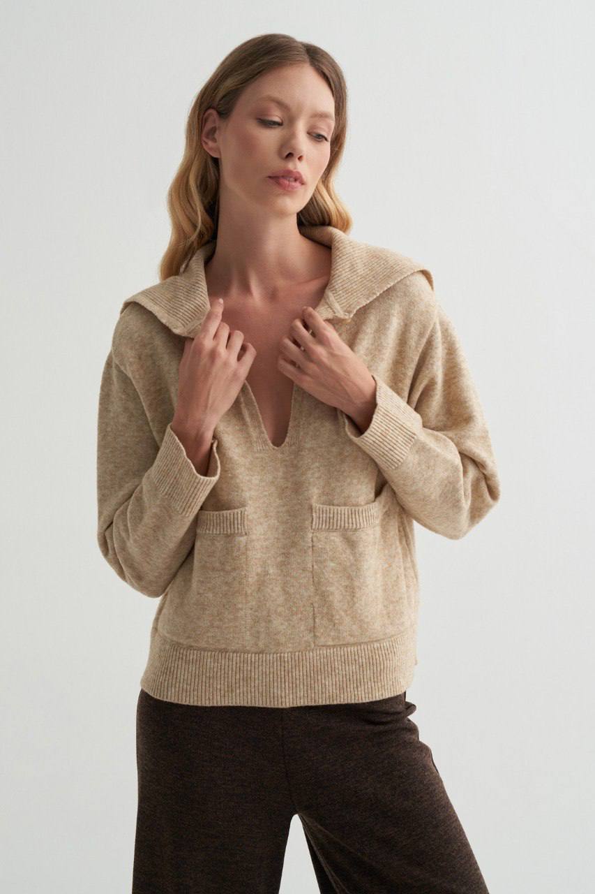 Свитер оверсайз с воротником-поло, полосатый, с вышивкой, бежевый