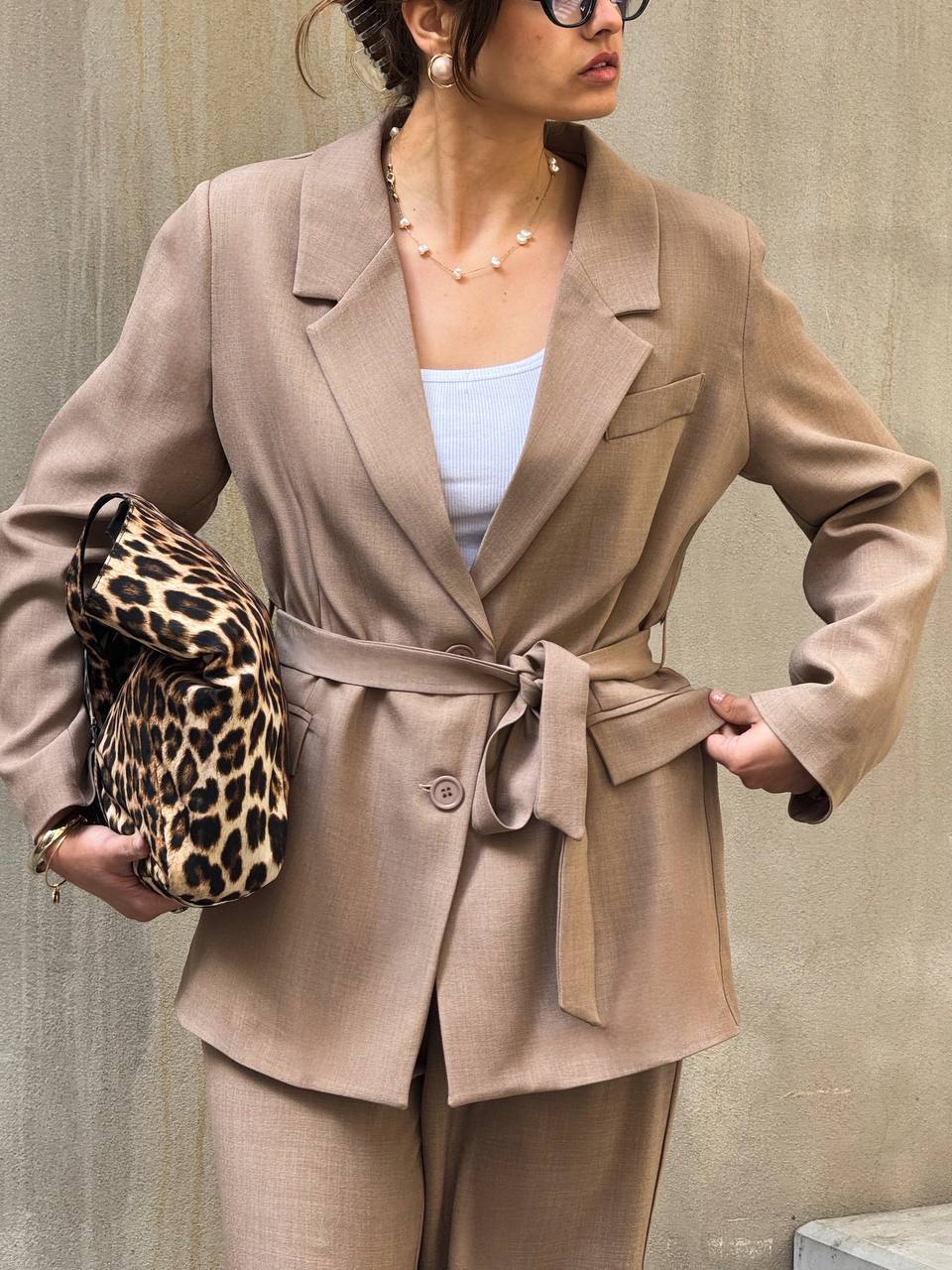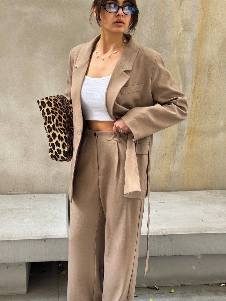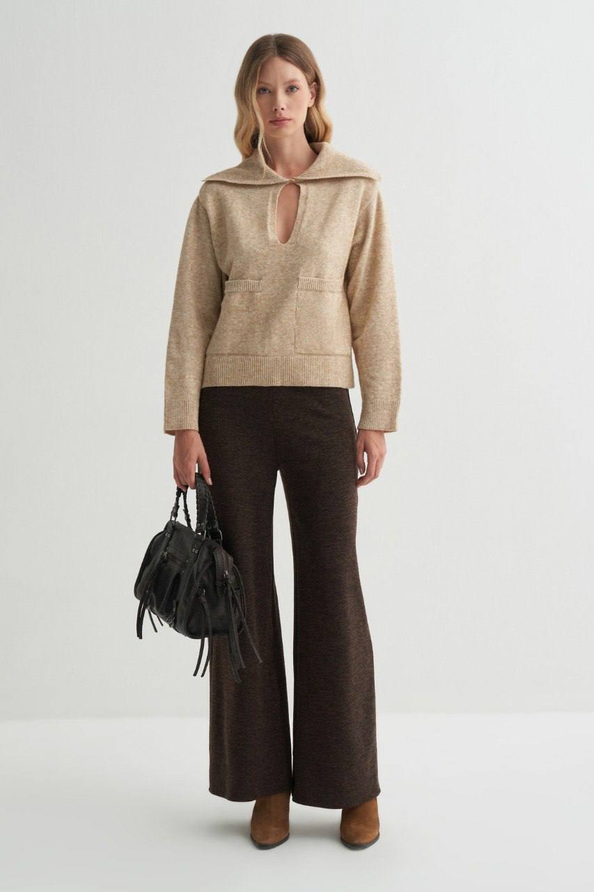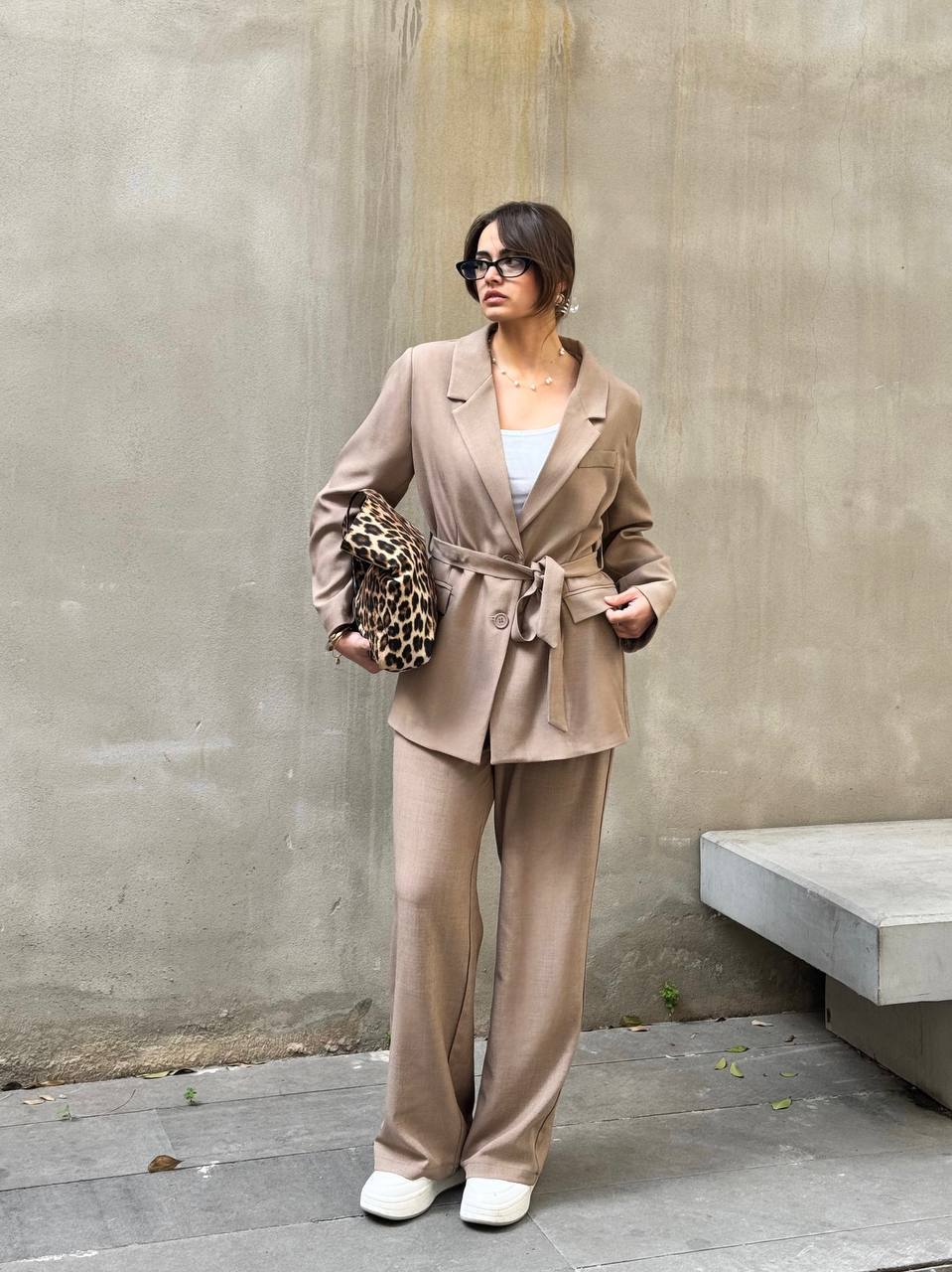 Брюки с испанскими штанинами, поясом на шнурке и деталями на шве, бежевого цвета
