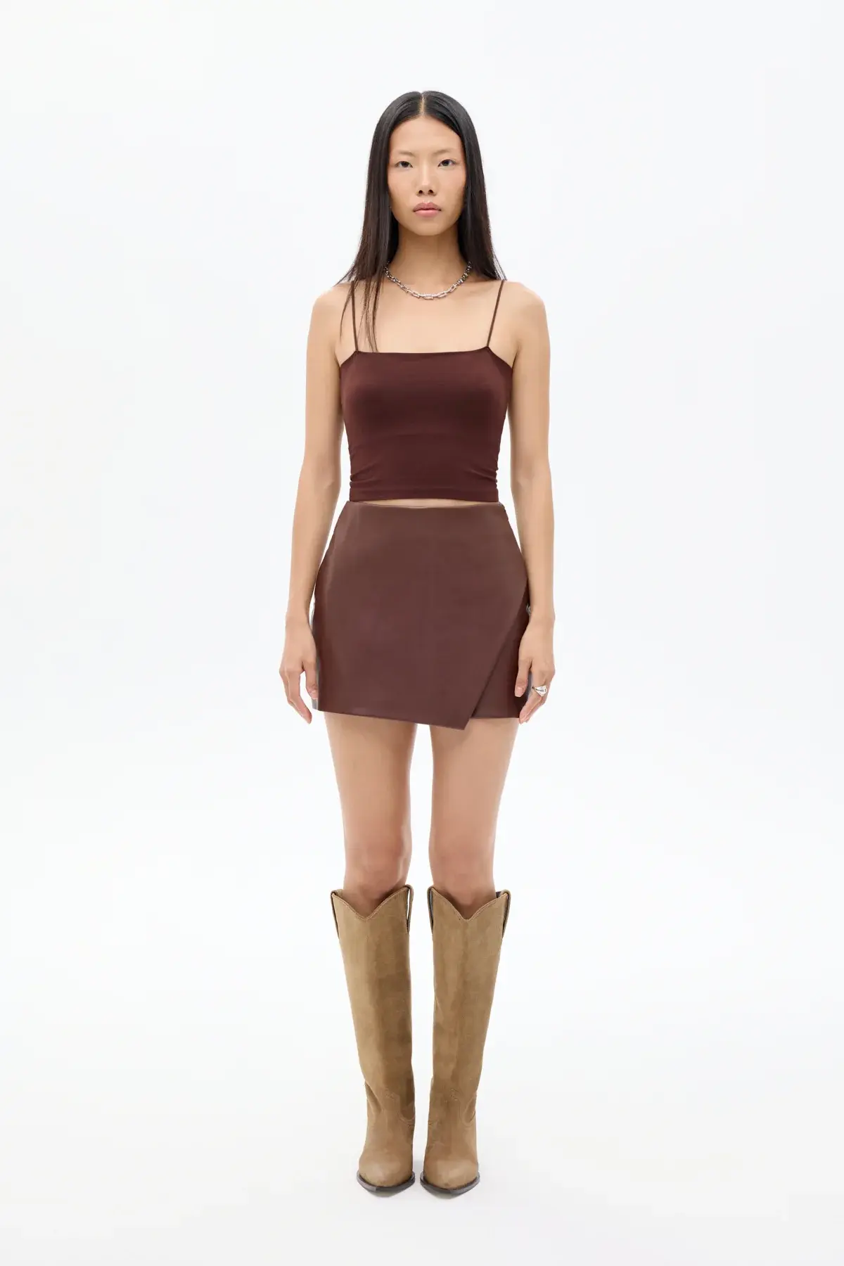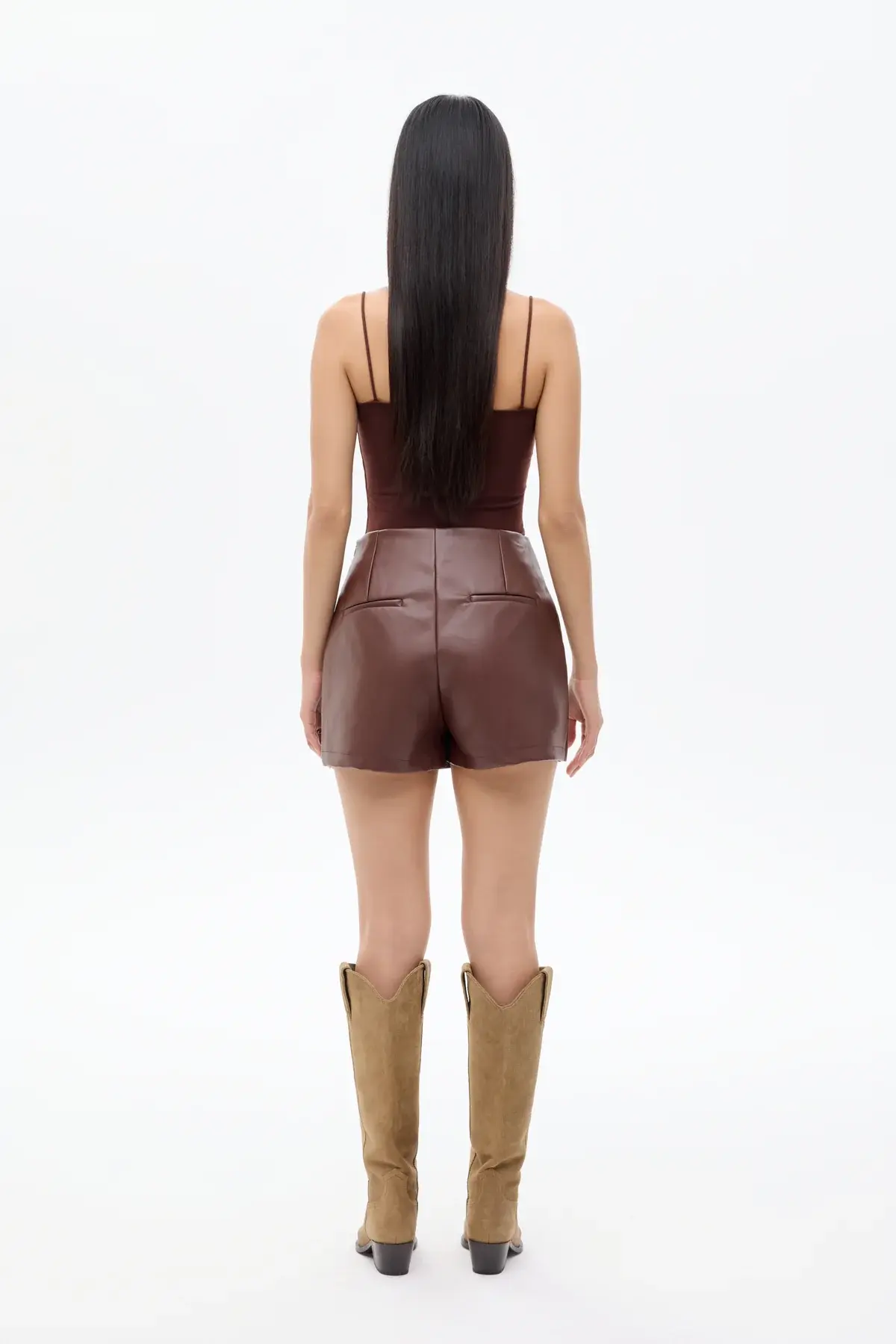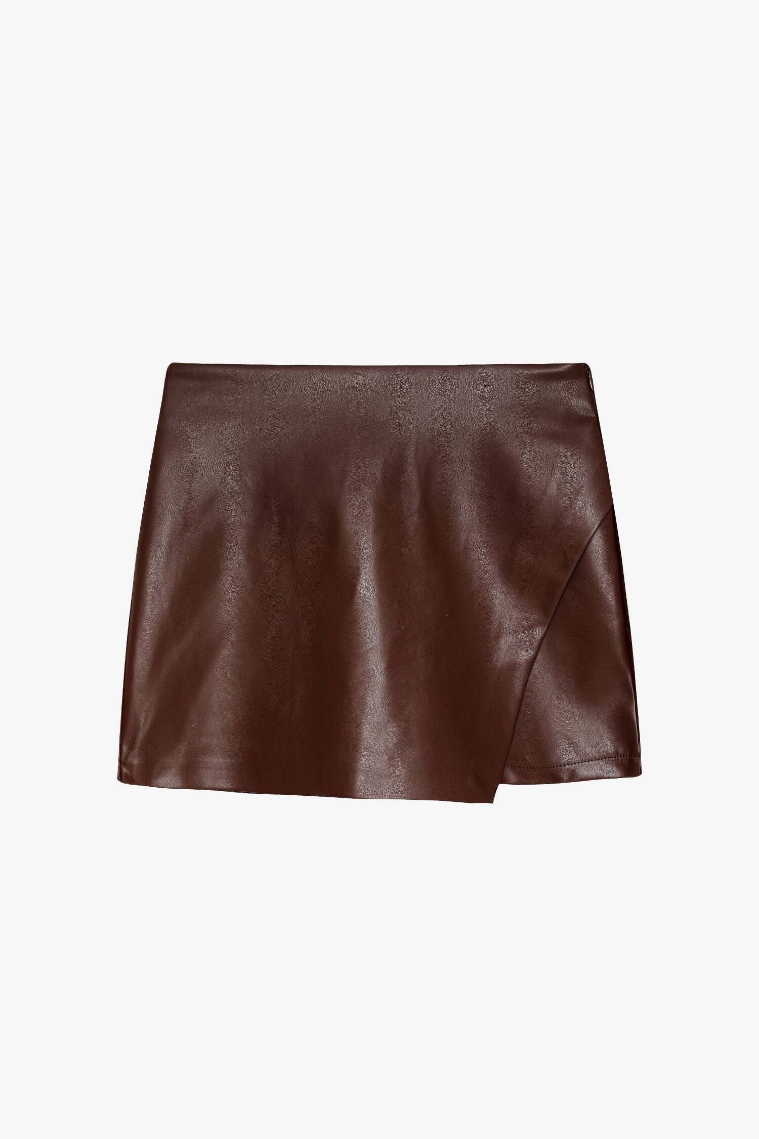 Мини-юбка-шорты с кожаной отделкой и поперечным карманом, коричневая