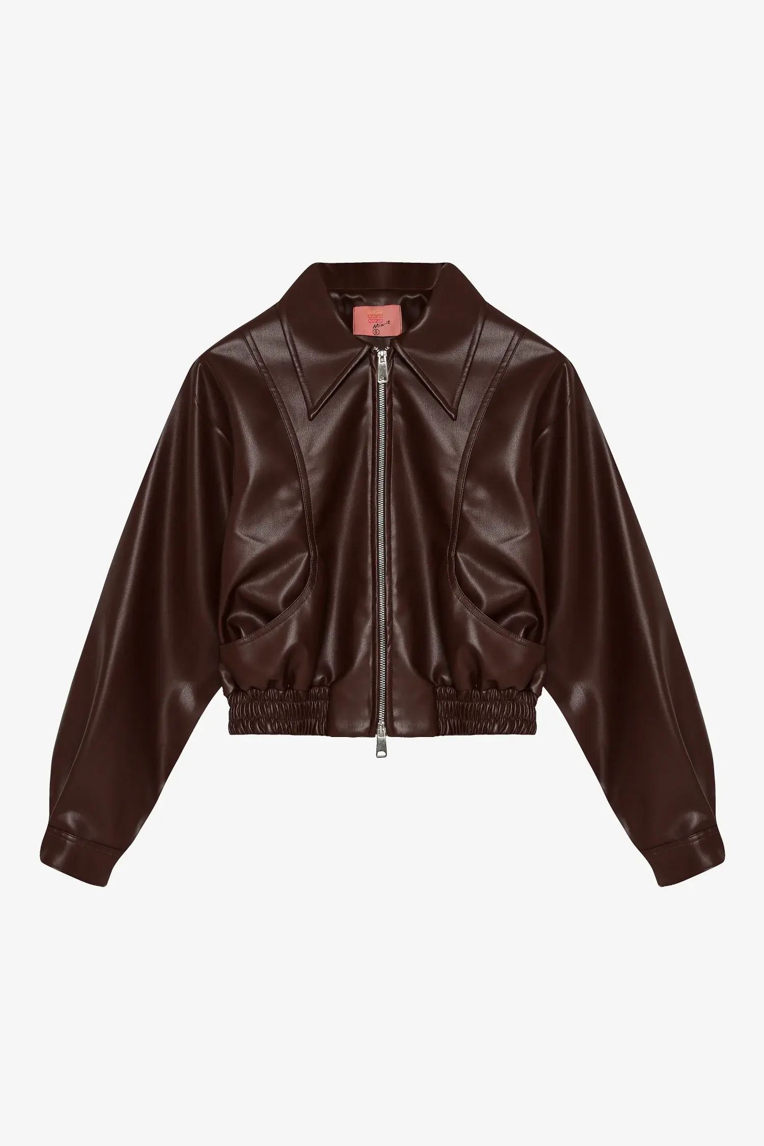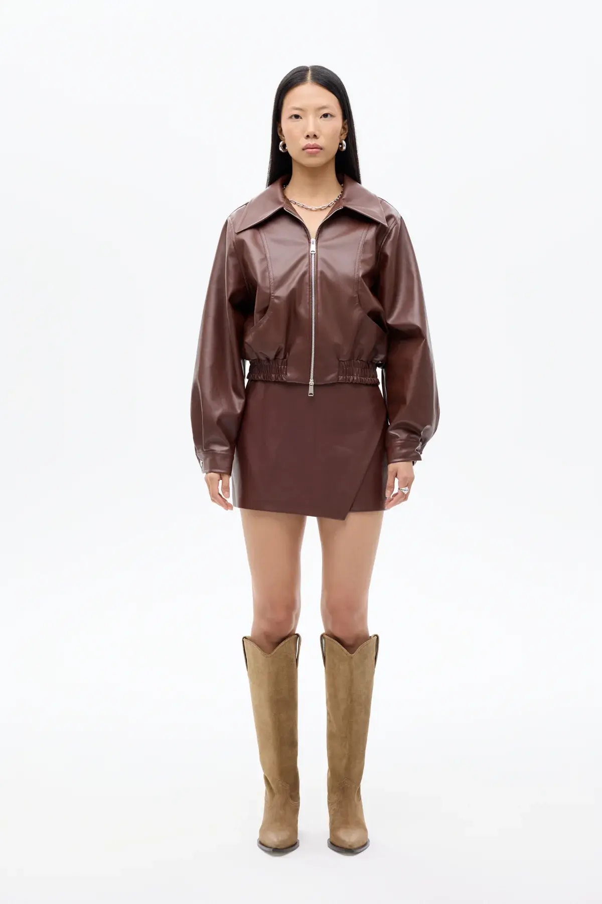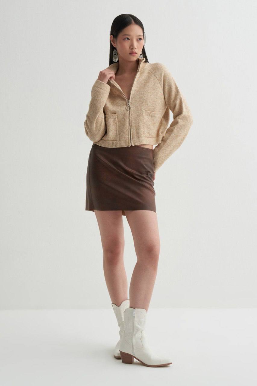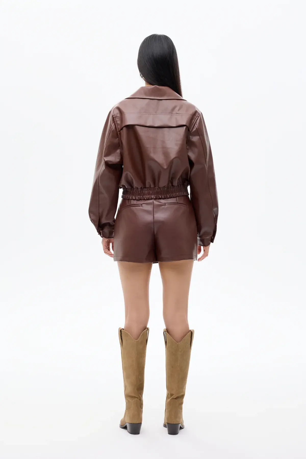Мини-юбка-шорты с кожаной отделкой и поперечным карманом, коричневая