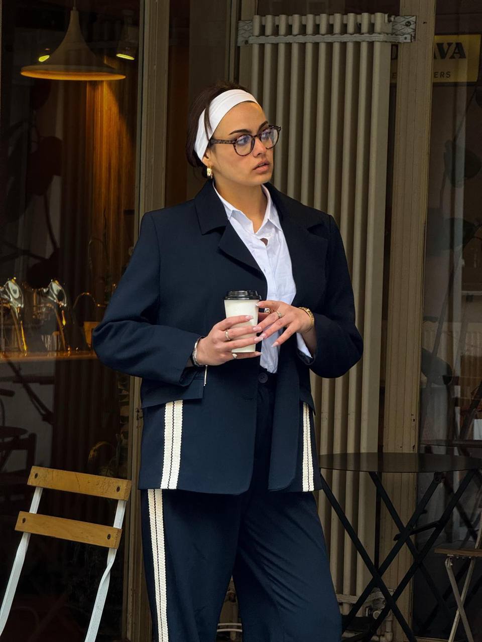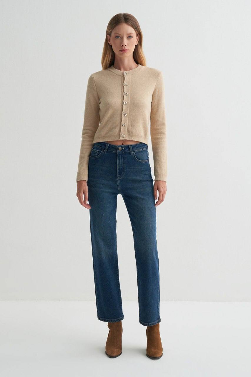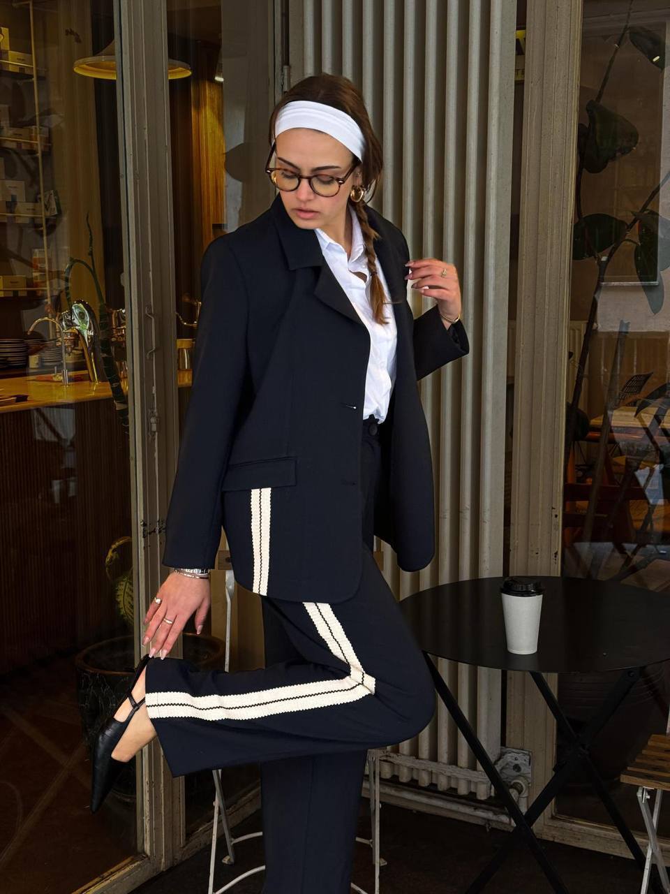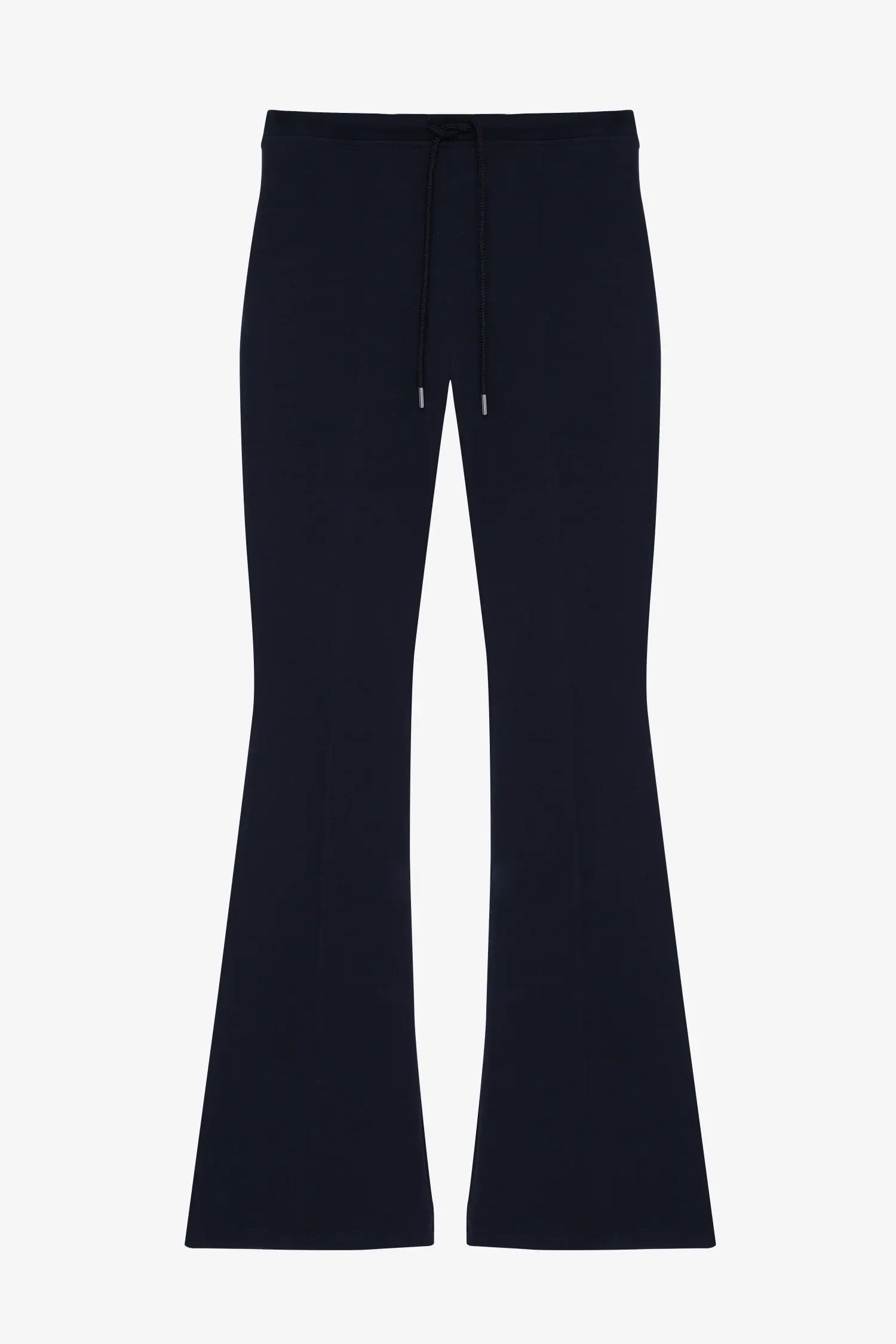 Брюки с испанскими штанинами, поясом на шнурке и деталями на шве темно-синего цвета
