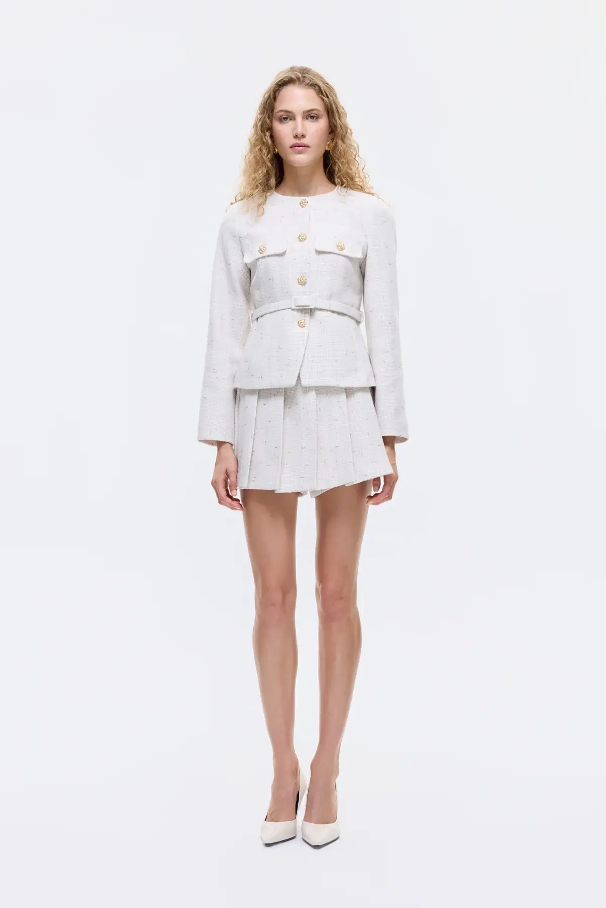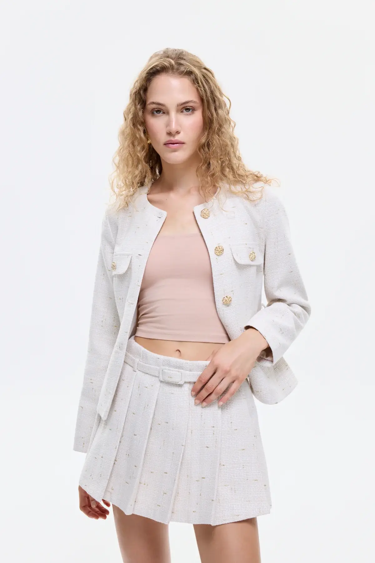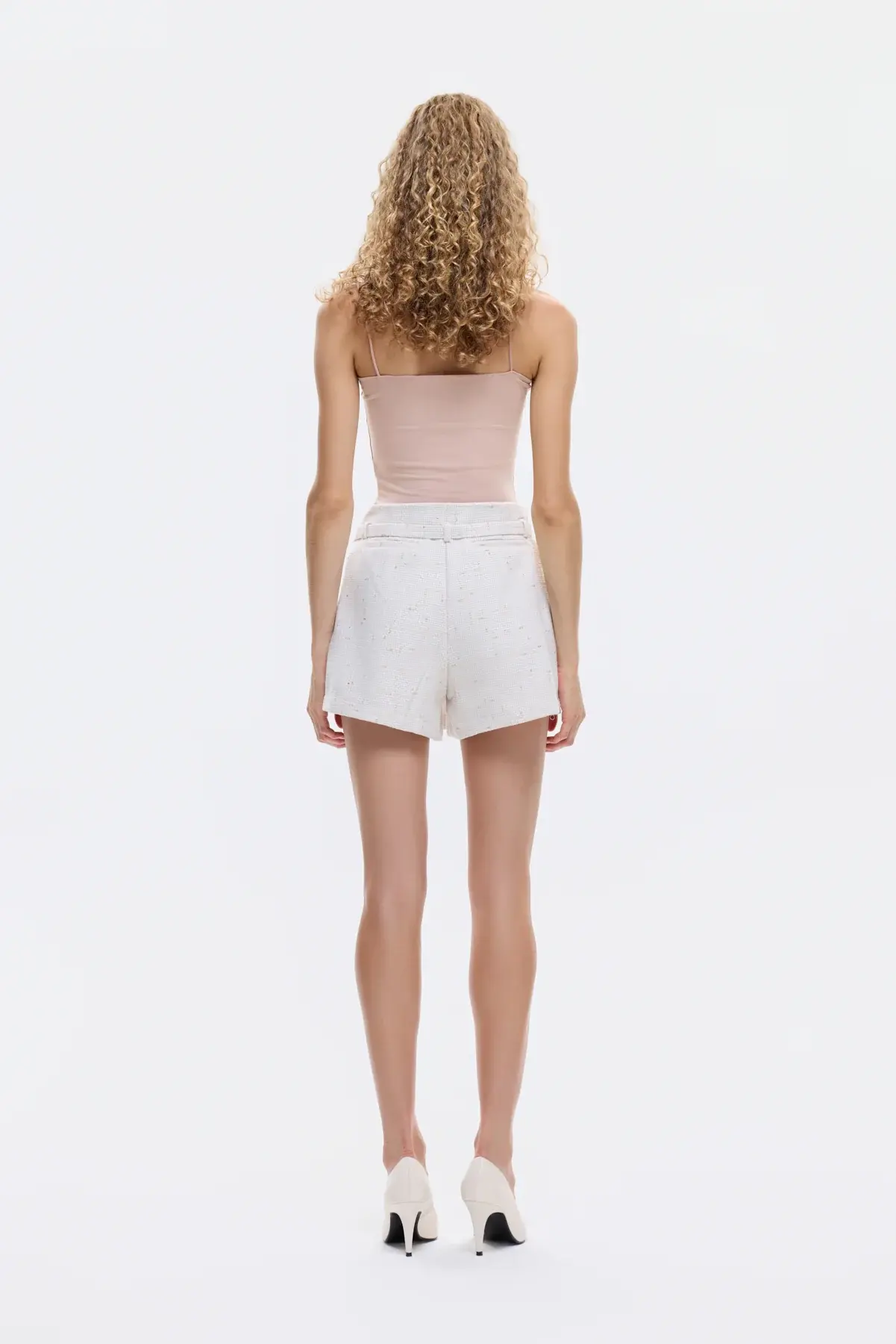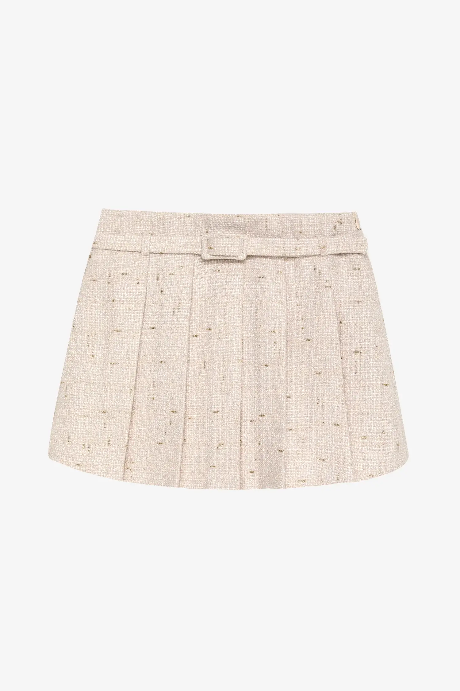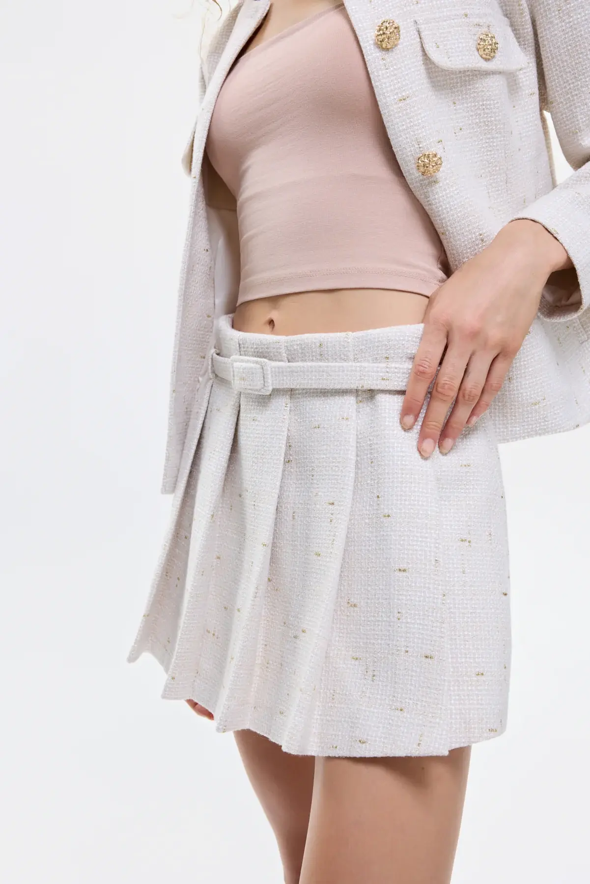 Мини-юбка-шорты из твида с плиссировкой и деталями на поясе бежевого цвета
