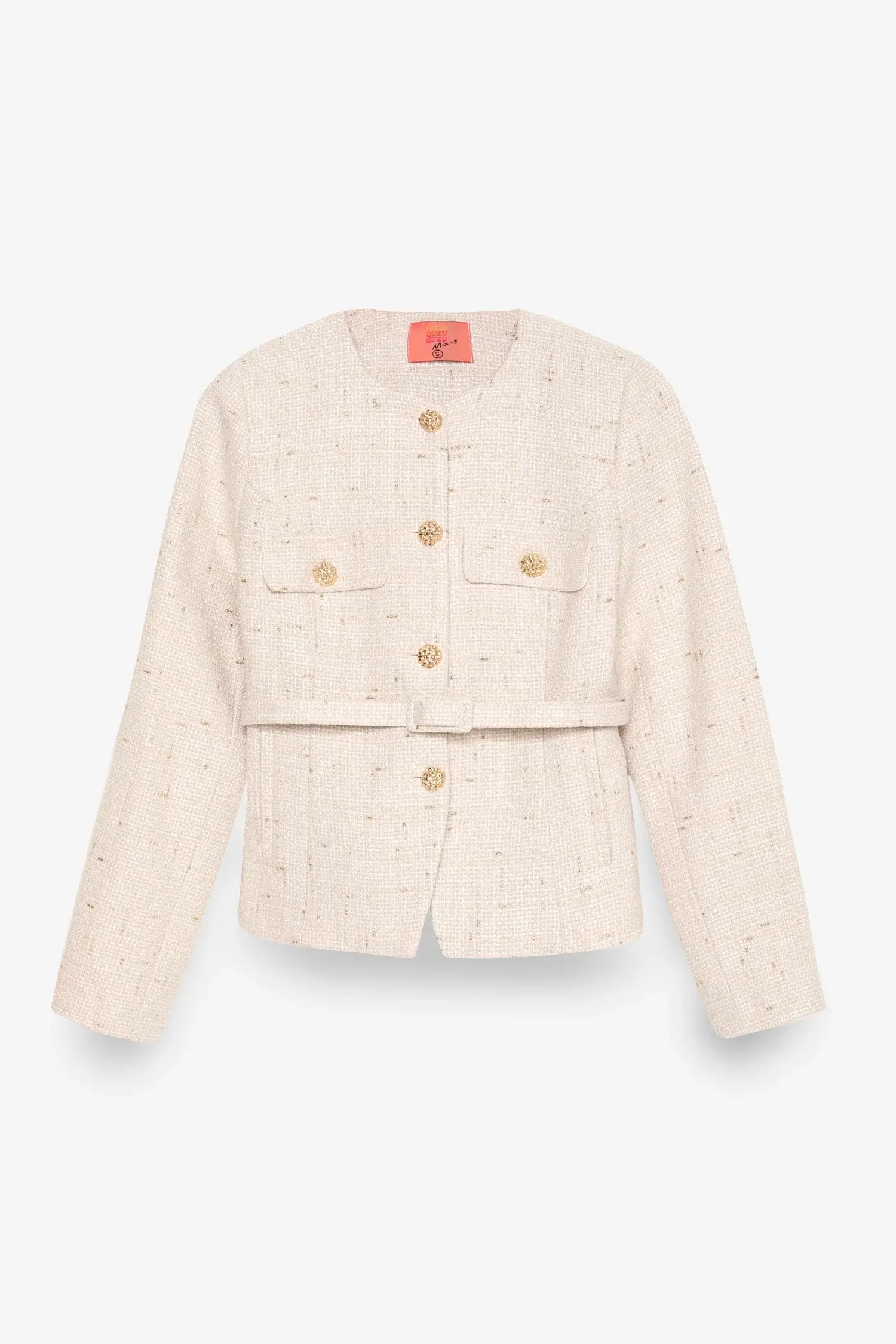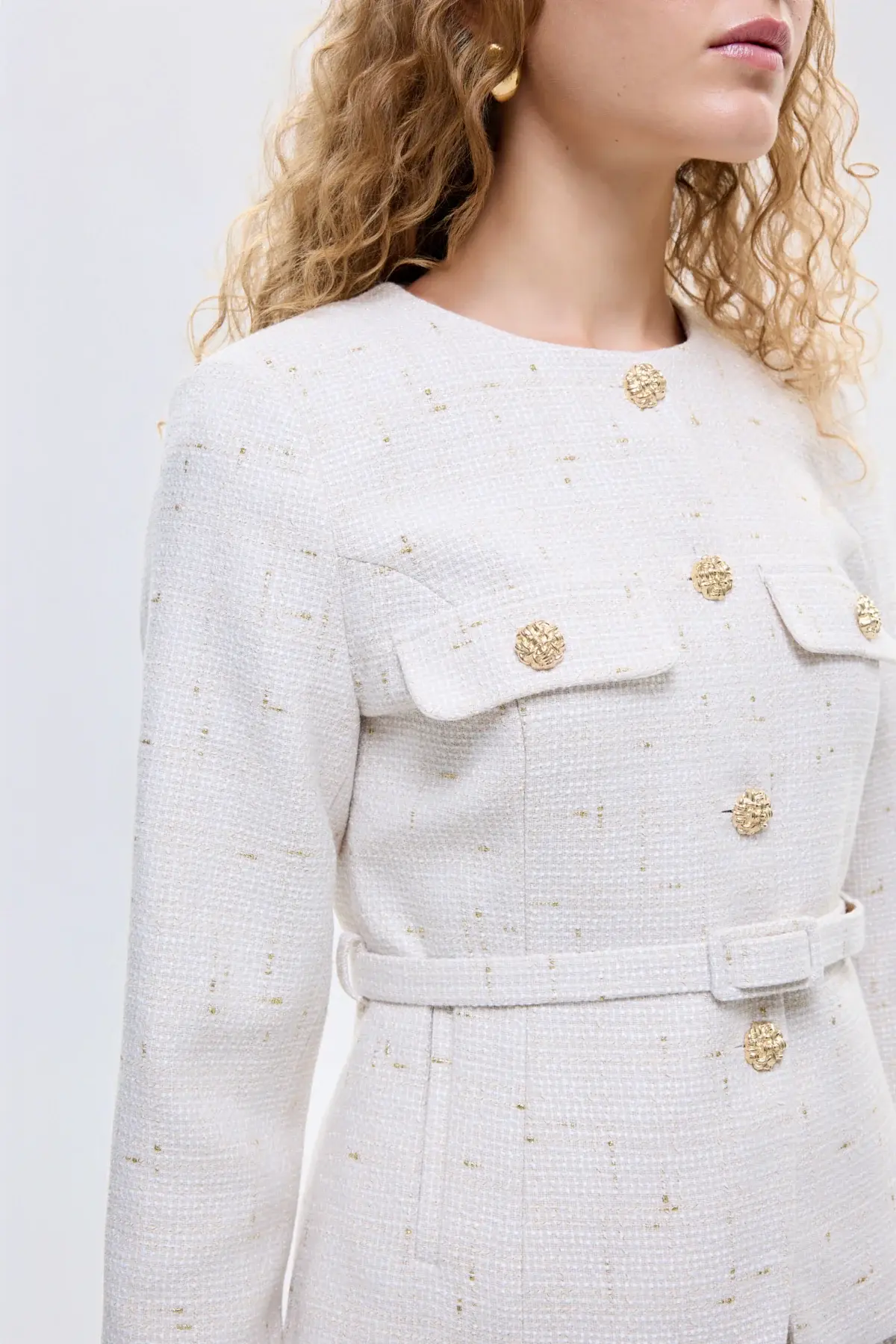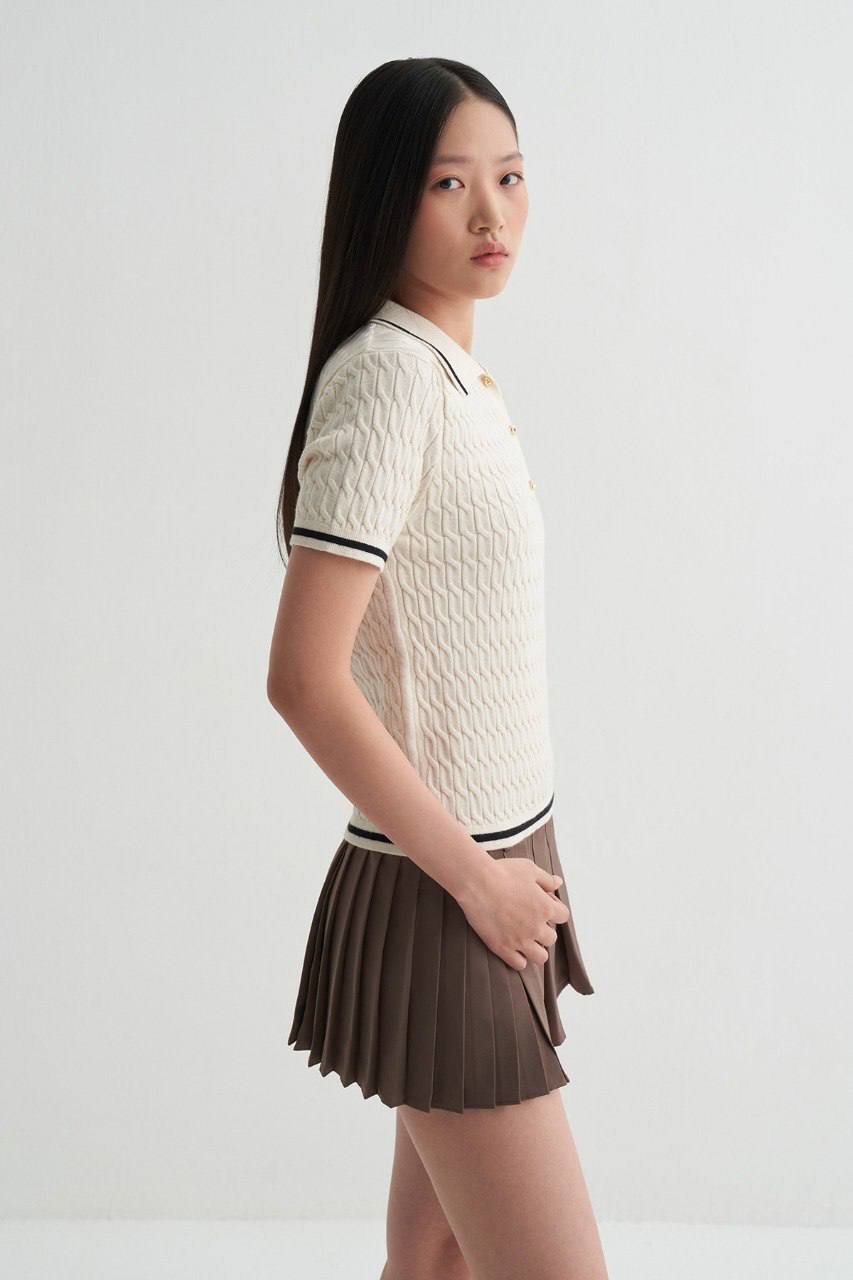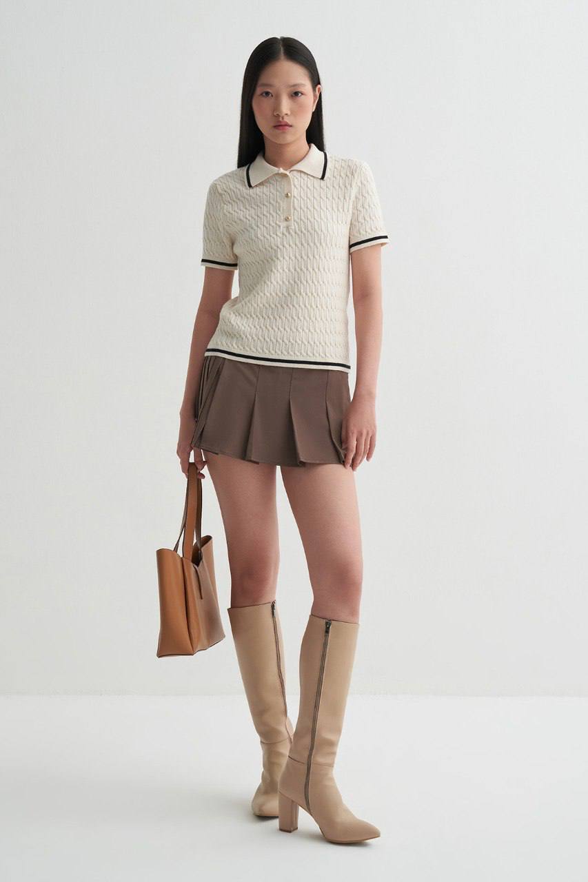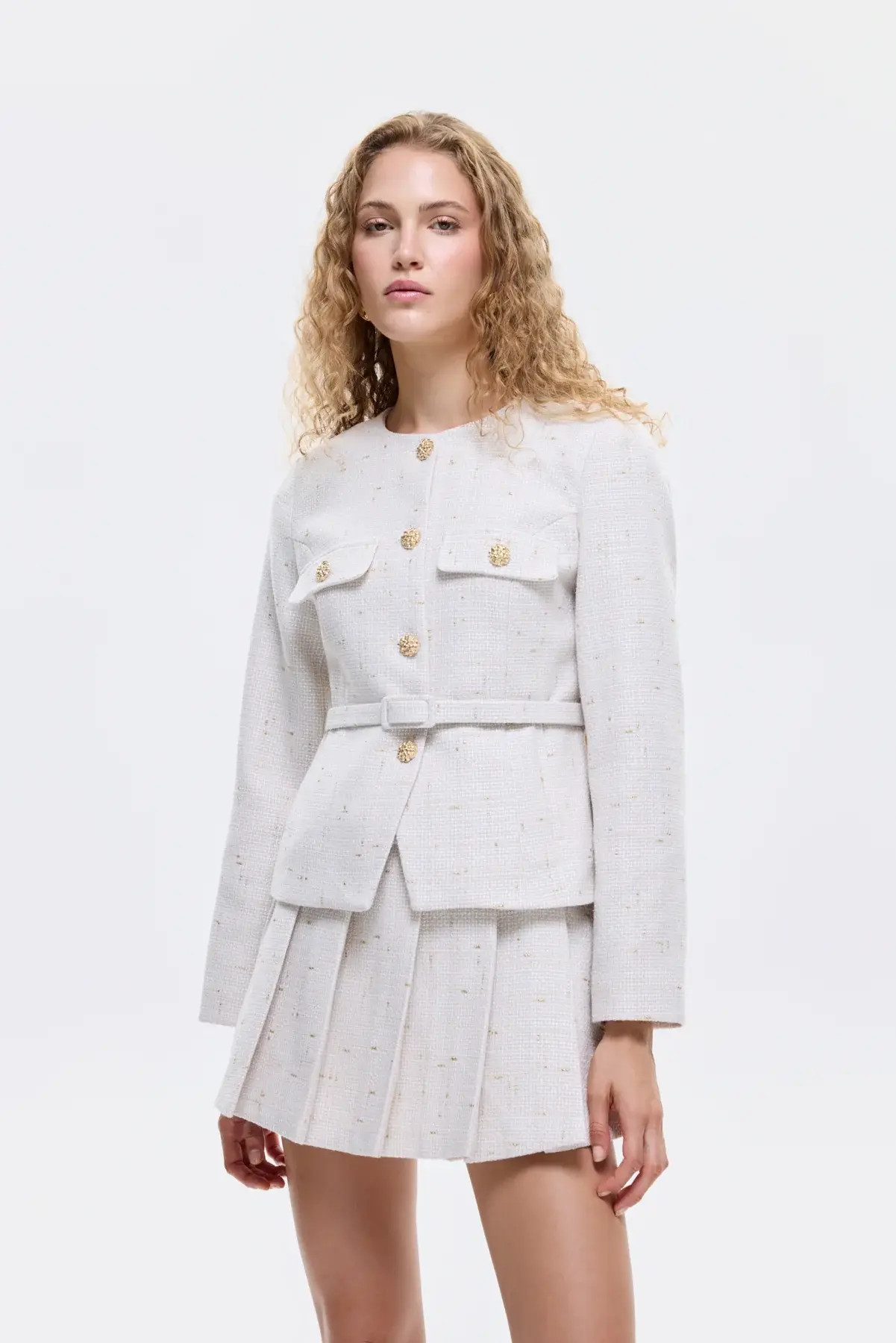 Мини-юбка-шорты из твида с плиссировкой и деталями на поясе бежевого цвета